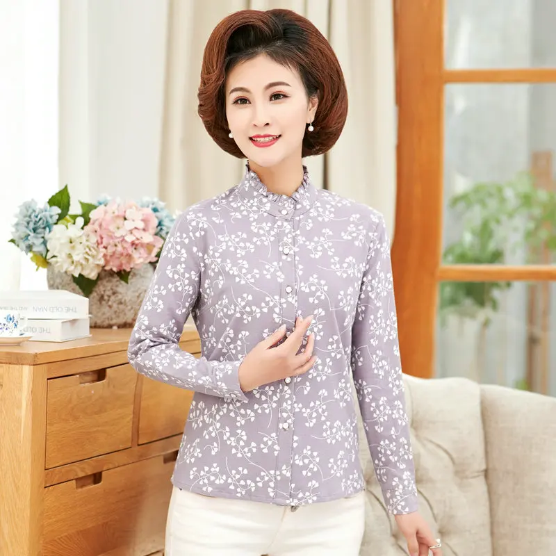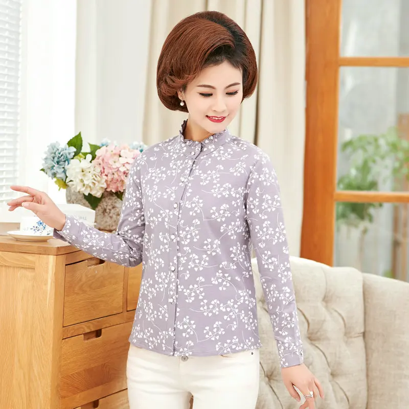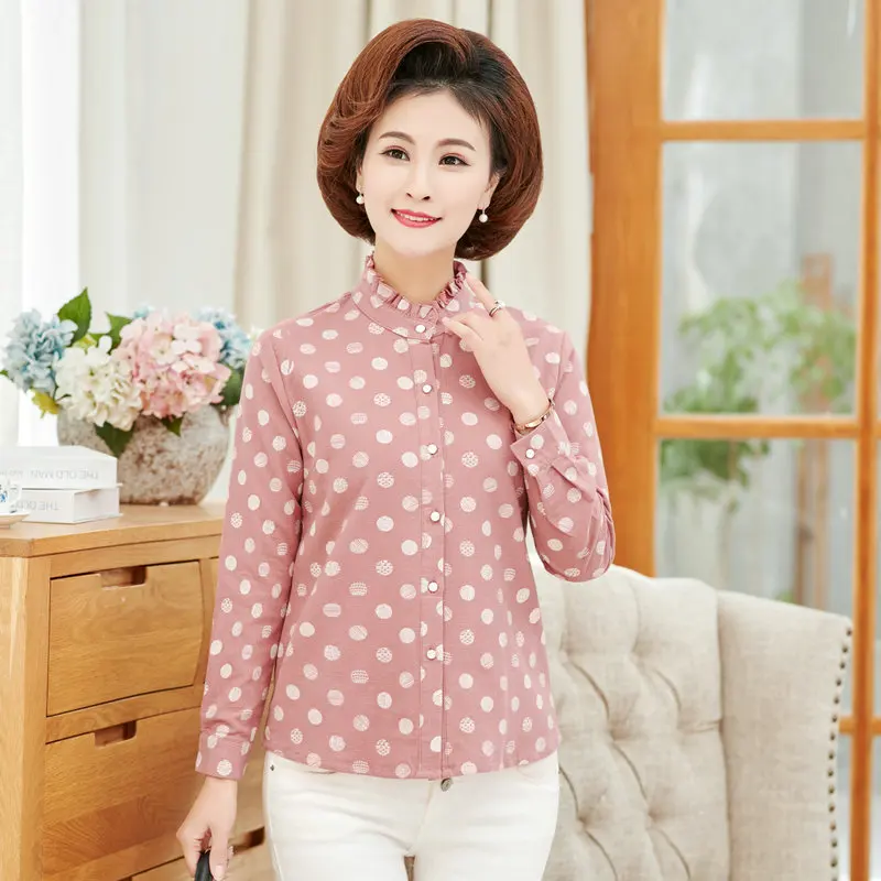 Images of Spring Women Casual Shirts Pink Polka Dot Light Green Purple Flower Printing Cotton Tops Ruffle Button Front Shirt Woman New :